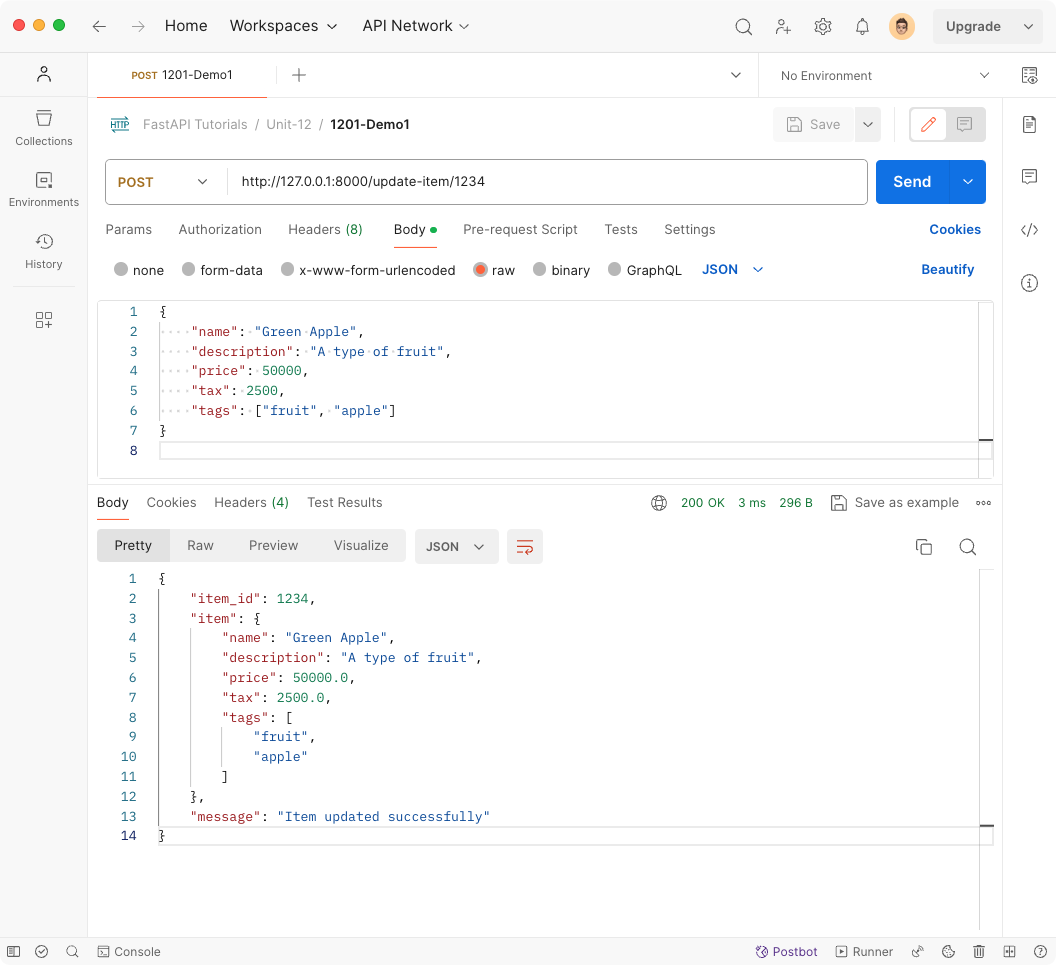 In this unit, we have introduced how to enhance request body in FastAPI to allow the server program to capture more complex inputs using list fields and nested models in combination with Pydantic model.